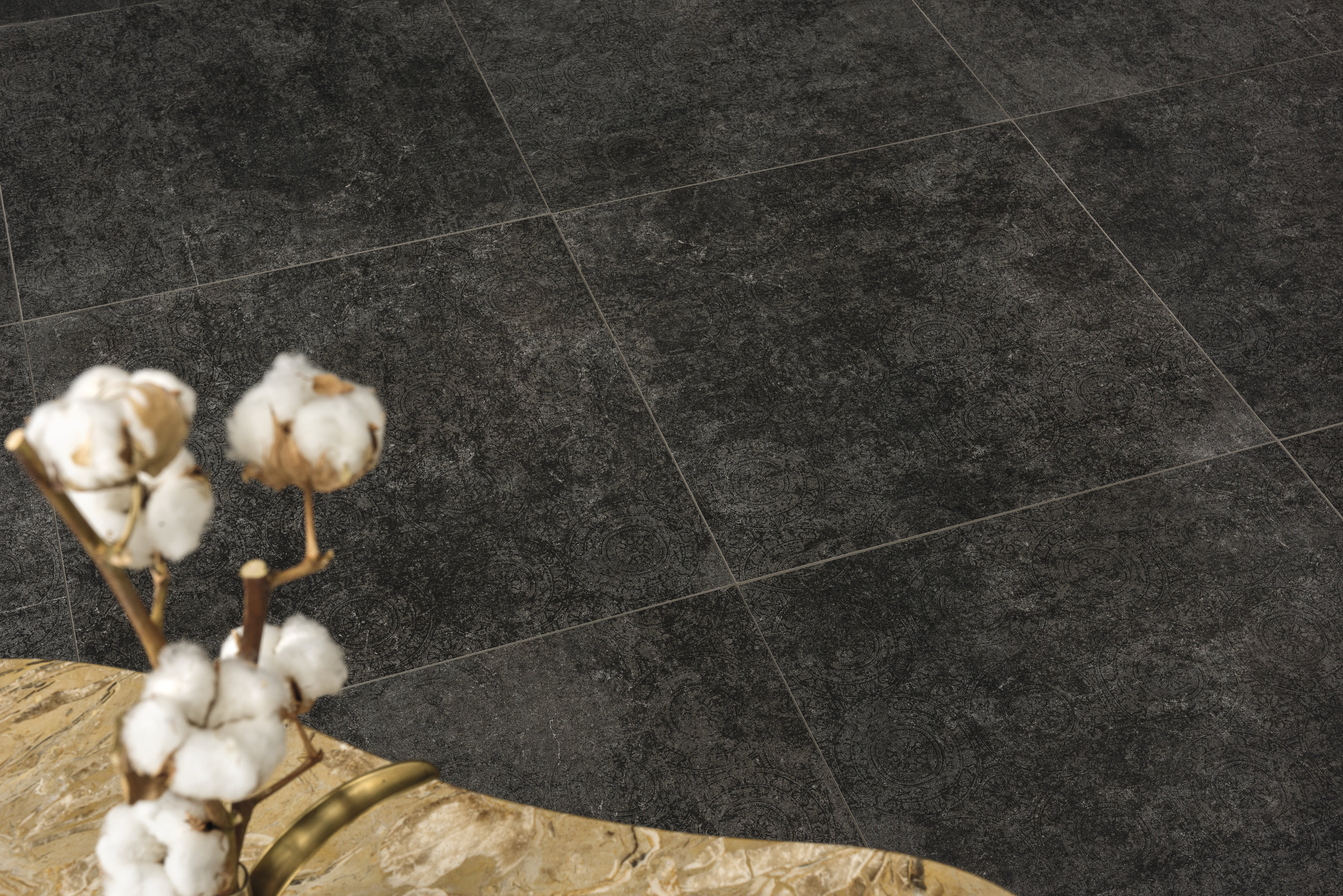 Mit ihren partiell in Erscheinung tretenden Ornamenten enthüllt die schieferfarbene Wand- und Bodenfliese Dark Ornament ein in mehrfacher Hinsicht geheimnisvolles Wesen. Vielschichtig wie der Blick in die Tiefen des nachtschwarzen Sternenhimmels entfaltet die leicht orientalisch anmutende Formgebung eine bei einer keramischen Fliese nie gekannte Samtigkeit. Eingesetzt als variierendes Dekorelement, bringt diese Kontrastfliese das raffinierte Spiel von Licht und Schatten zu einer an asiatische Seidenteppiche erinnernden Blüte.