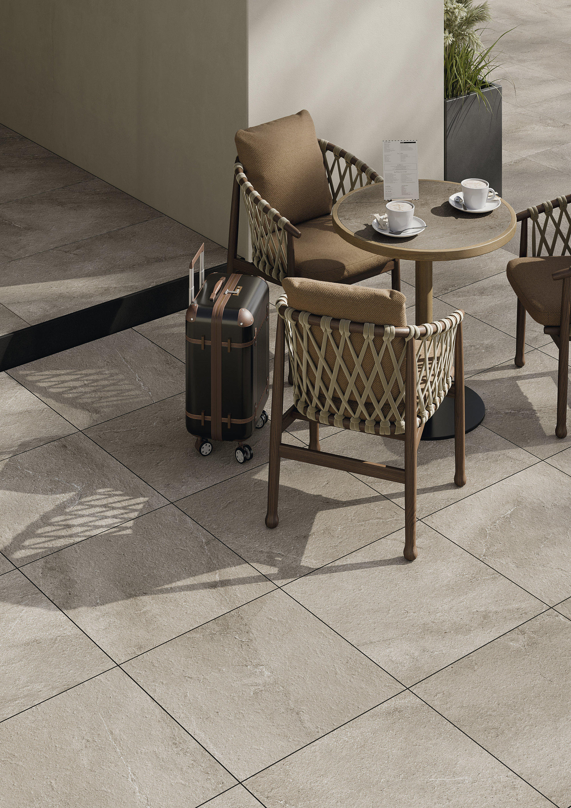 Le superfici da 6 e 8 mm di spessore per interni in abbinamento alle soluzioni in grès porcellanato da 20 mm per esterni creano transizioni otticamente fluide tra spazi interni ed esterni.
